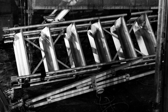 暗闇の工事現場で横倒しになったアルミ脚立に車のライトが反射した瞬間ただそれだけ📷