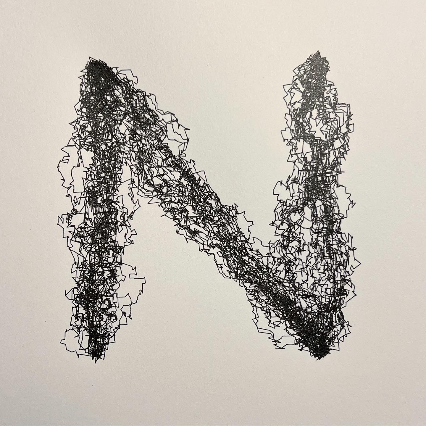 For N in #36daysoftype I looked at a bunch of different things based on noise and random seeding. Ended up with this design based on anchor point displacement with 30 copies of a single-stroke N.