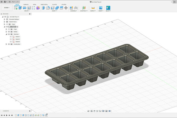 Fifth #fusion360 exercise: an ice cube tray. 3D design using the Extrude Cut, Taper Angle, Shell, Midplane Construction Plane and Sweep tools. #3Dprinting #3Dbeginners #cad