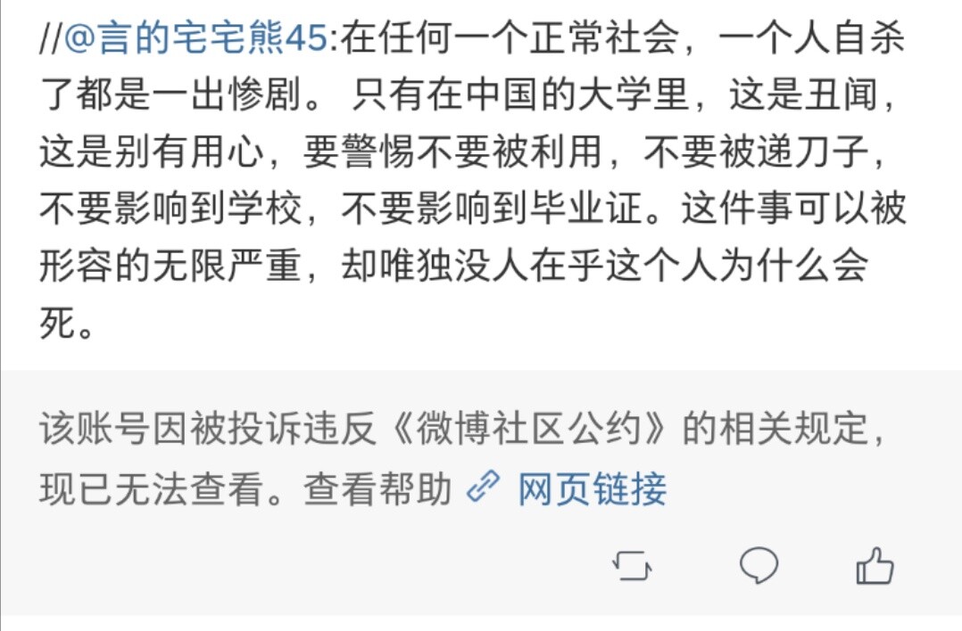 在任何一个正常社会,一个人自杀了都是一出惨剧。 只有在中国的大学里,这是丑闻,这是别有用心,要警惕不要被利用,不要被递刀子,不要影响到学校,不要影响到毕业证。这件事可以被形容的无限严重,却唯独没人在乎这个人为什么会死。