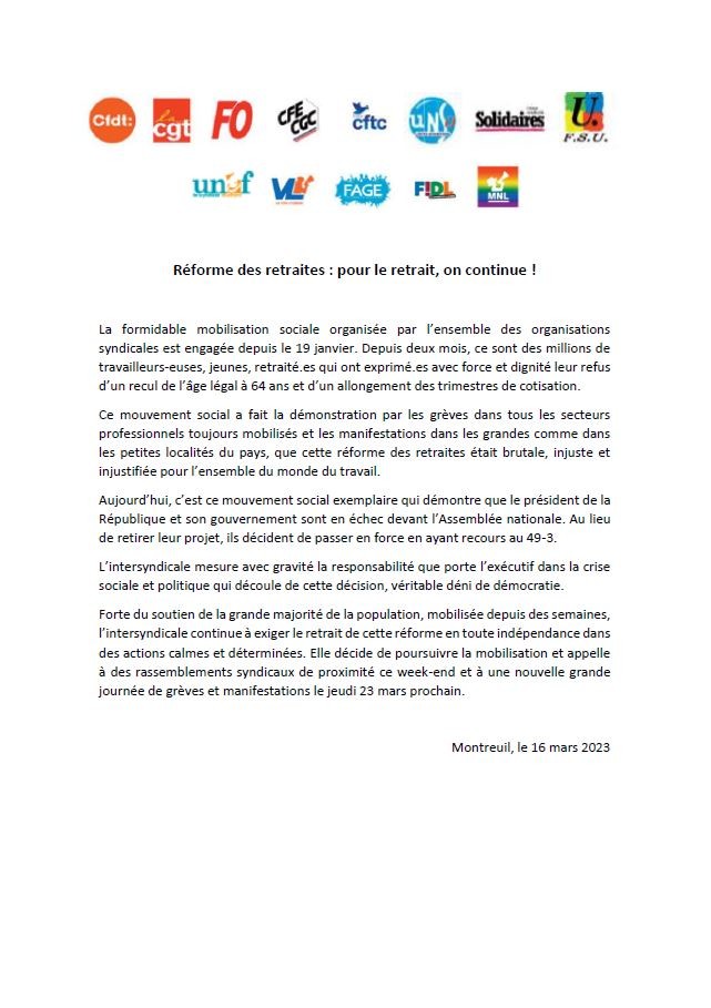 Déclaration de l'intersyndicale nationale hier au soir. Rendez-vous en action cette fin de semaine, et toute la semaine prochaine jusqu'au 23/03 et après ✊✊🔥🔥