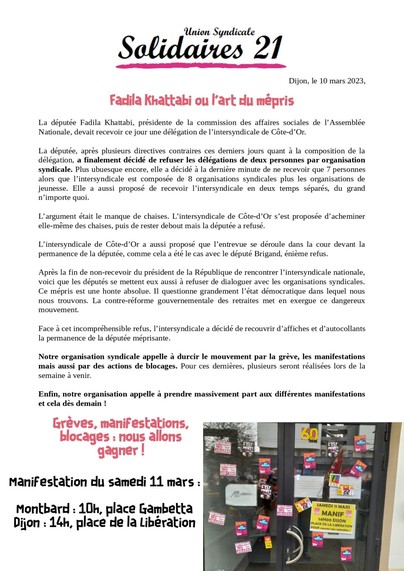 Tract de Solidaires 21 suite au refus de la députée Fadila Khattabi de recevoir l'intersyndicale de Côte d'Or.