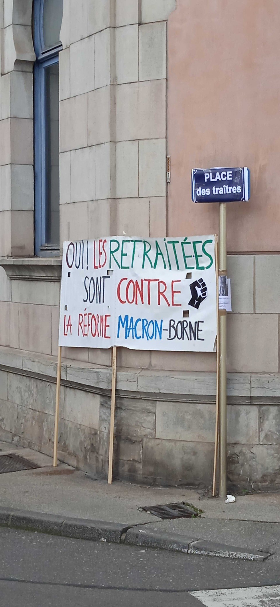 1/3 Ce jeudi 16 mars, jour du vote à l'Assemblée Nationale de la #reformedesretraites a eu lieu une action devant la permanence d'E. Alauzet soutien revendiqué de cette réforme inique.