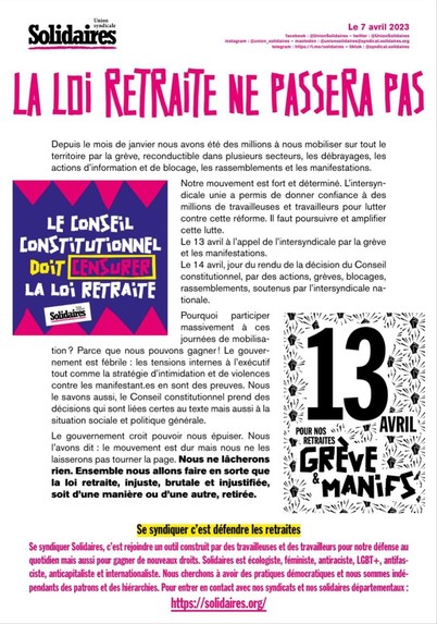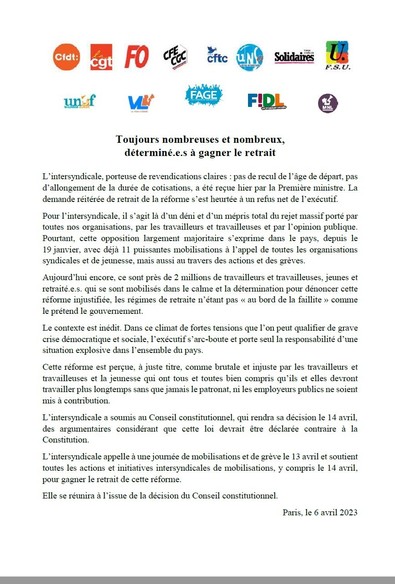 Communiqué intersyndical appelant à une nouvelle journée d'action le 13/04 prochain veille de la décision du Conseil Constitutionnel.