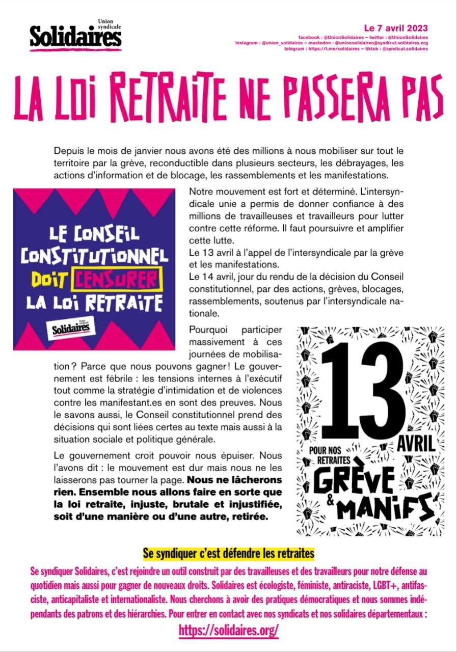L'Union Solidaires appelle à une journée de grève massive le 23 mars prochain contre la #reformedesretraites et l'usage de l'article 49.3.