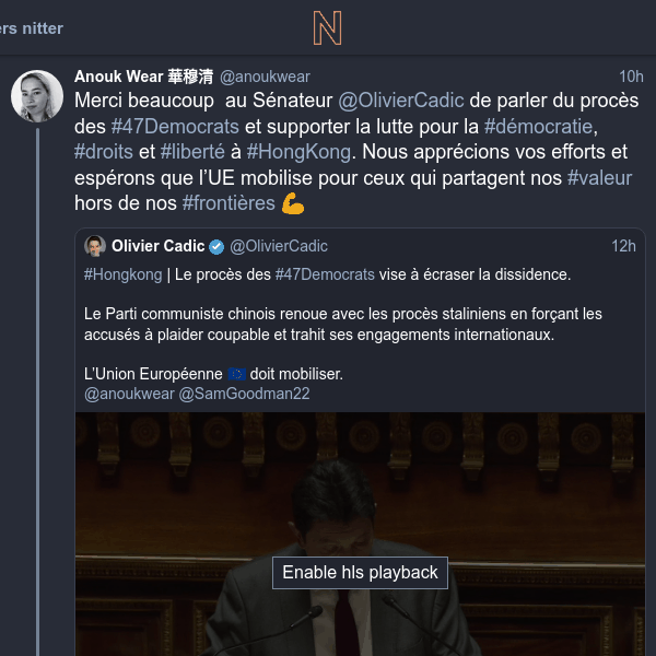 @anoukwear RT by @hk_watch: Merci beaucoup au Sénateur @OlivierCadic de parler du procès des #47Democrats et supporter la lutte pour la #démocratie, #droits et #liberté à #HongKong. Nous apprécions vos efforts et espérons que l’UE mobilise pour ceux qui partagent nos #valeur hors de nos #frontières 💪 https://nitter.hongkongers.net/anoukwear/status/1637575552415432709#m