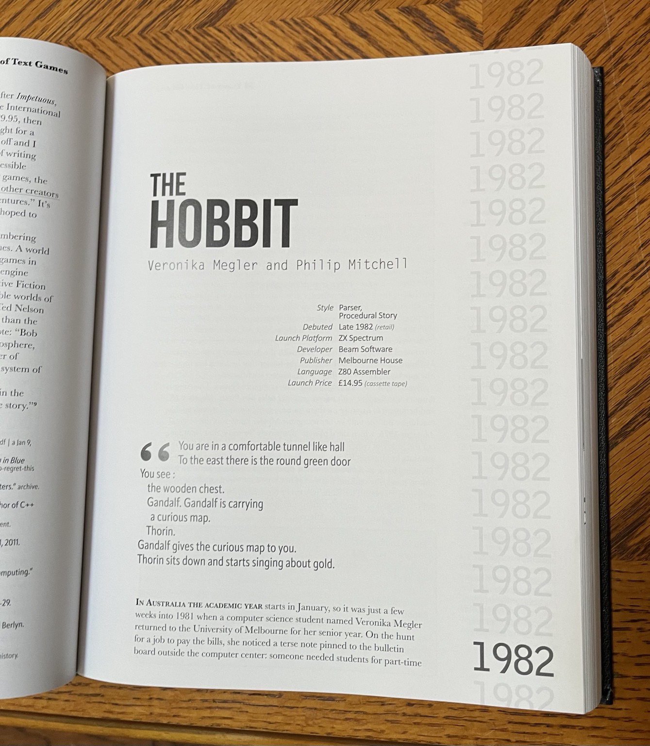 I’ve only read the chapter on The Hobbit, which I haven’t played yet. I played The Crack of Doom as a kid though, which I only beat as an adult with help from a walkthrough. But already I’m very happy with the 50 Years of Text Games book. Great treatment: talks about the game, its authors and development, its quirks, and its reception. I want to play it now! #50YearsOfTextGames #hobbit