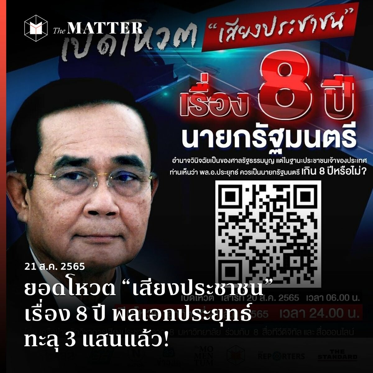 เวลา 13.00 น. ของวันนี้ มียอดโหวต “เสียงประชาชน” เรื่อง 8 ปีพลเอกประยุทธ์ ทะลุ 3 แสนแล้ว! ก่อนจะปิดโหวตคืนนี้เวลา 24.00 น.