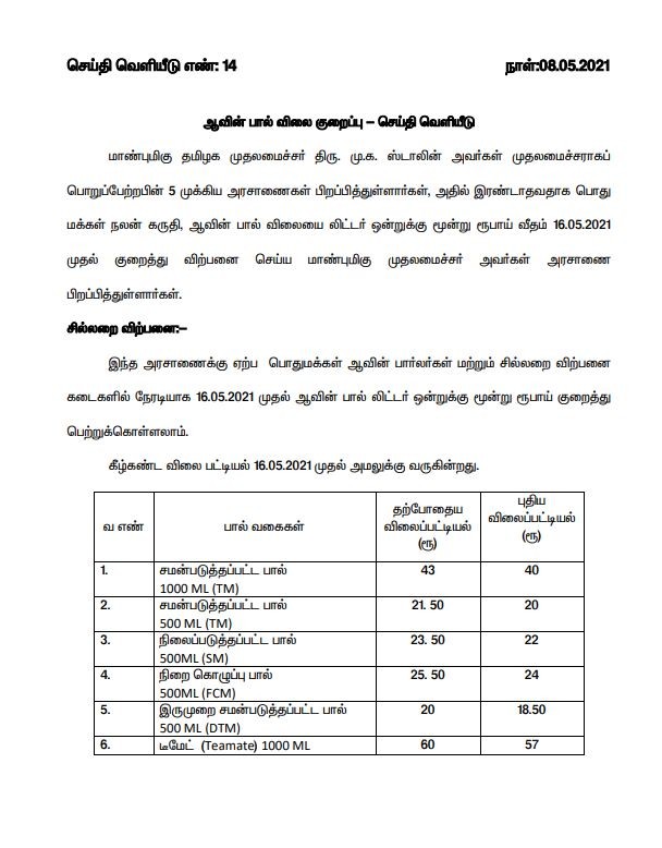 #Breaking: ஆவின் பால் விலை லிட்டருக்கு ₹3 குறைத்து முதலமைச்சர் மு.க ஸ்டாலின் உத்தரவிட்ட நிலையில், தற்போது புதிய விலைப்பட்டியல் குறித்த அறிவிப்பு வெளியாகியுள்ளது. #AavinMilk #MilkPrice #DMK @mkstalin@twitter.com @Avadi_Nasar@twitter.com