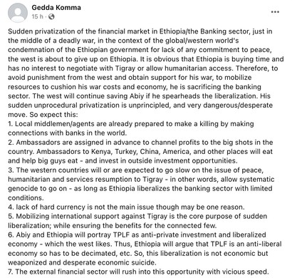 ...to avoid punishment from the west and obtain support for his war, to mobilize resources to cushion his war costs and economy, he is sacrificing the banking sector. The west will continue saving #AbiyAhmedAli if he spearheads the liberalization.