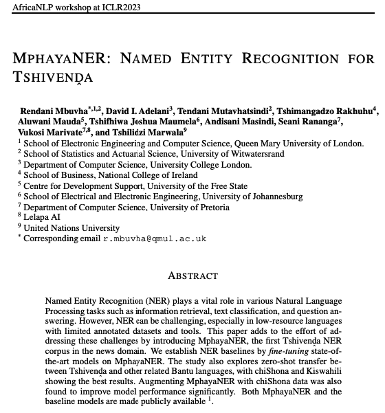 MphayaNER: Named Entity Recognition for Tshivenda <> https://arxiv.org/abs/2304.03952