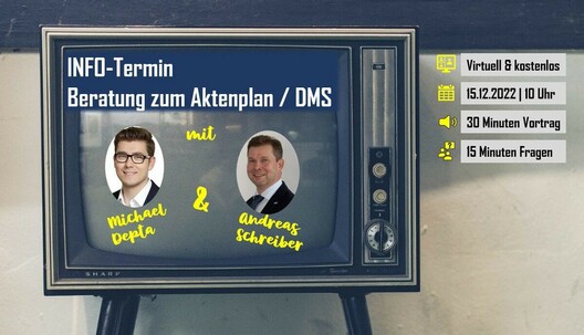 Virtueller Info-Termin im Dezember zum Thema #Aktenplan und #DMS mit Michael Depta & @andreasSchreib@twitter.com am 15.12. von 10.00 bis 10:45 Uhr. Kostenlose Teilnahme & keine Teilnahmebegrenzung. Mehr Infos und die Zugangsdaten gibt es hier: https://www.kgst.de/wir-beraten-sie-zum-aktenplan-und-dms