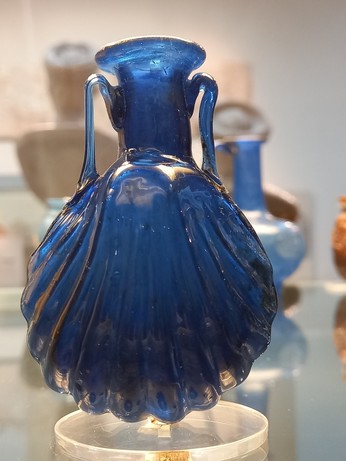 A #Roman blue glass bottle with a body in the shape of a shell. It was made some 1900+ years ago, & was probably used to hold perfume by its lucky original owner(s) #RomanArchaeology #AncientGlass