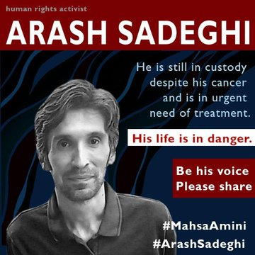 "Arash Sadeghi, anima gentile, esempio di umanità, è stato arrestato 18 giorni fa in #Iran. Nessuno sa dove sia. Le sue condizioni di salute sono gravi. Ha il cancro. Ha bisogno di farmaci. Condividiamo. Cerchiamo di essere la sua voce."