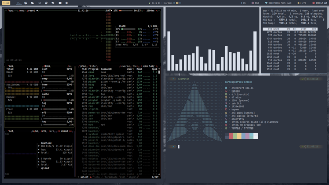 Actualizacion de #Archcraft. Despues de un buen tiempo puedo darle uso con tranquilidad a esta vieja intel... Firefox con 3 pestañas abiertas, element, telegram tambien abiertos... memoria controlada, procesador tambien.