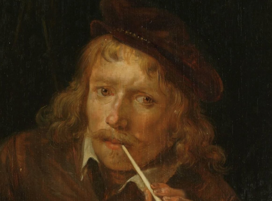 Close up of a small painting by Gerard Dou 'Man smoking a Pipe' ca. 1650, oil on panel. He's looking bit quizzical. Loving the delicate brush marks and moulding of face and hair.