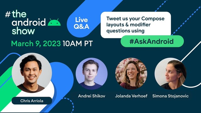 Tweet us your Compose layouts and modifiers questions using #AskAndroid. We've assembled a team of experts ready to answer your questions live!