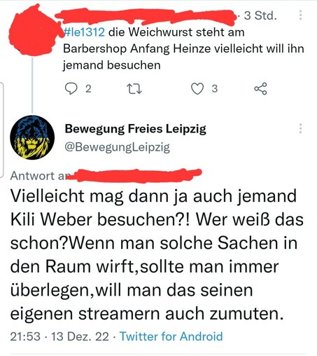 Die "friedlichen" rechten Montagsdemonstrant*innen mit ihren "friedlichen" Überlegungen mich mal "besuchen" zu kommen.