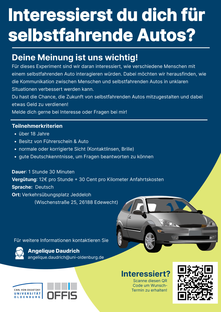 Wir suchen Teilnehmende für eine Studie zur Interaktion mit autonomen Fahrzeugen! Bei Interesse oder weiteren Fragen, bitte meldet euch unter "angelique.daudrich@uni-oldenburg.de"!