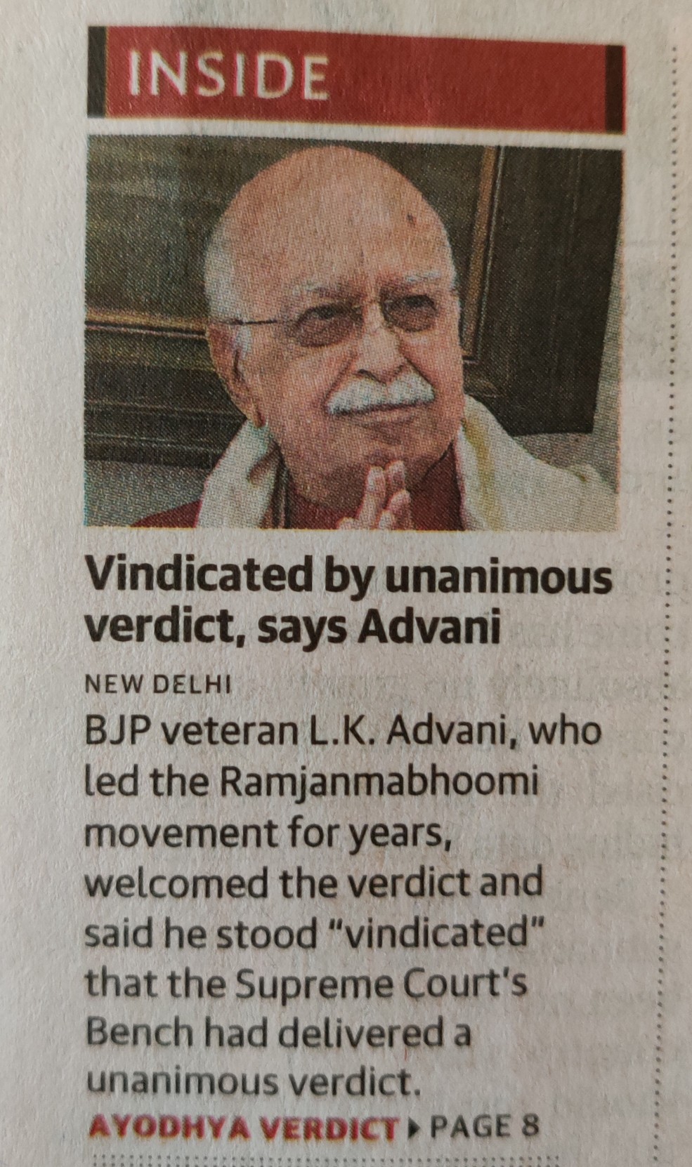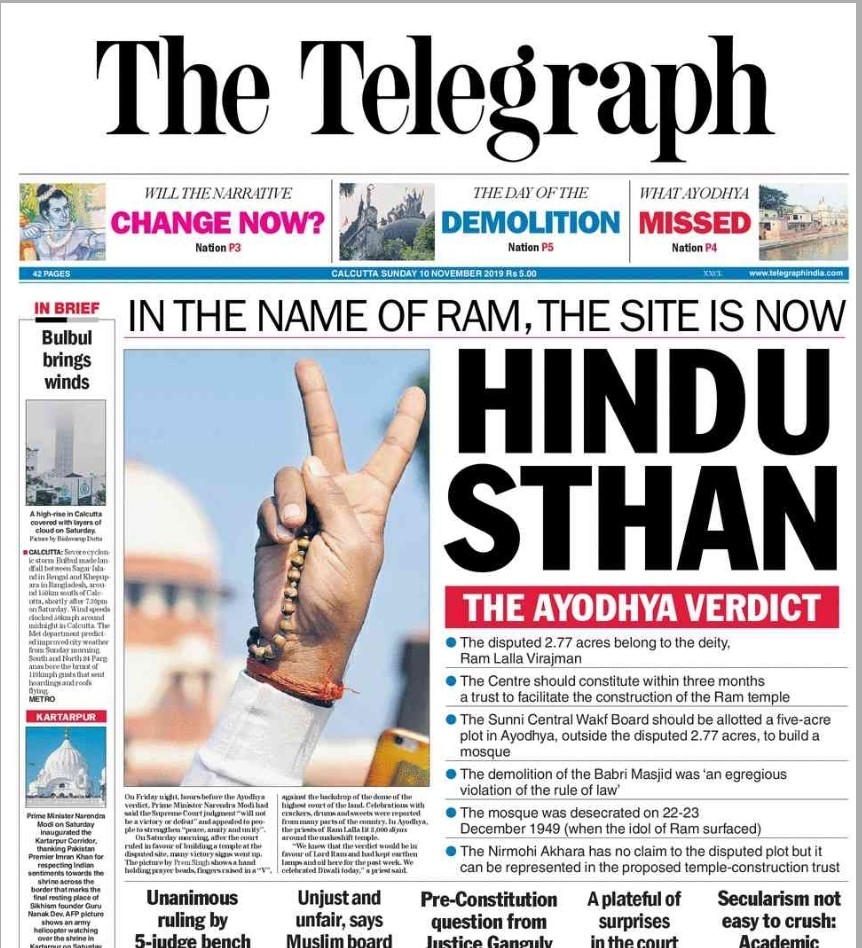 Telegraph headline on #AyodhaVerdict is as always sharp, yep, we are now Hindu Sthan!