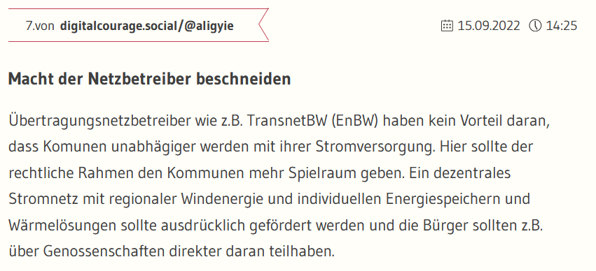 Es gibt immer mehr Berichte von Energieautarken Gemeinden, die Probleme mit ihren Netzbetreiber haben, was dazu geführt hat, dass sie eigene Leitungen legen mussten. Das muss nicht sein, da kann der Staat richtige Rahmenbedingungen setzen, damit das nicht notwendig sein muss.