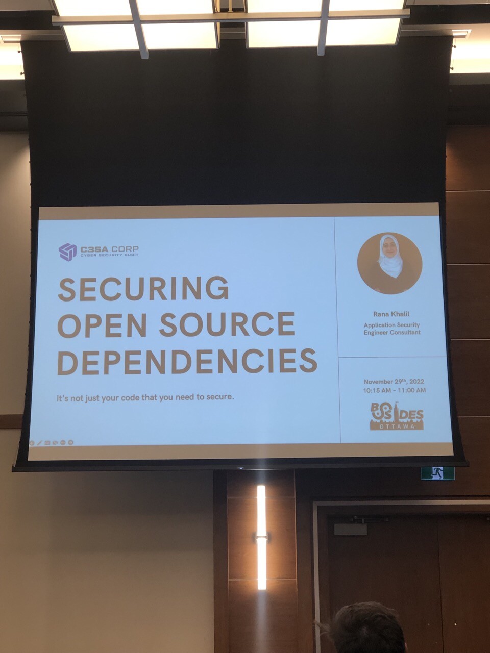 Kicking off my second day at #BSidesOttawa with “Securing Open Source Dependencies” with Rana Khalil.