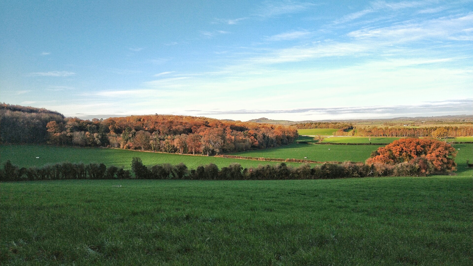 The view from the top of the farm - the Kylebeg Wood in the middle, joining onto Coillte's Oughaval Wood. The hedge nearest the camera has been there since at least the 1500s, and the rath beside it is a lot older than that.