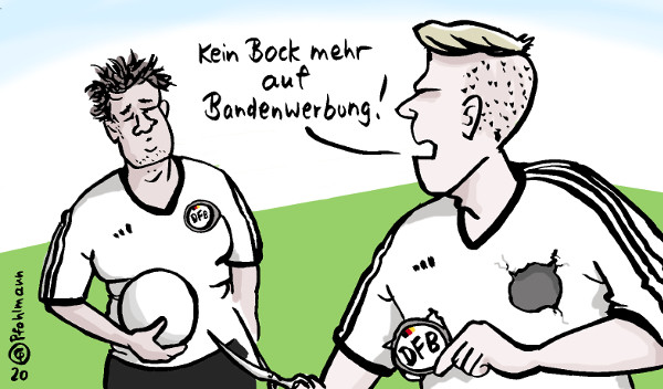 #fußball #nationalmannschaft #fußballtrikot #werbung #bandenwerbung #steuerhinterziehung #bandenkriminalität #dfb #steuern #karikatur #cartoon (c) www.pfohlmann.de