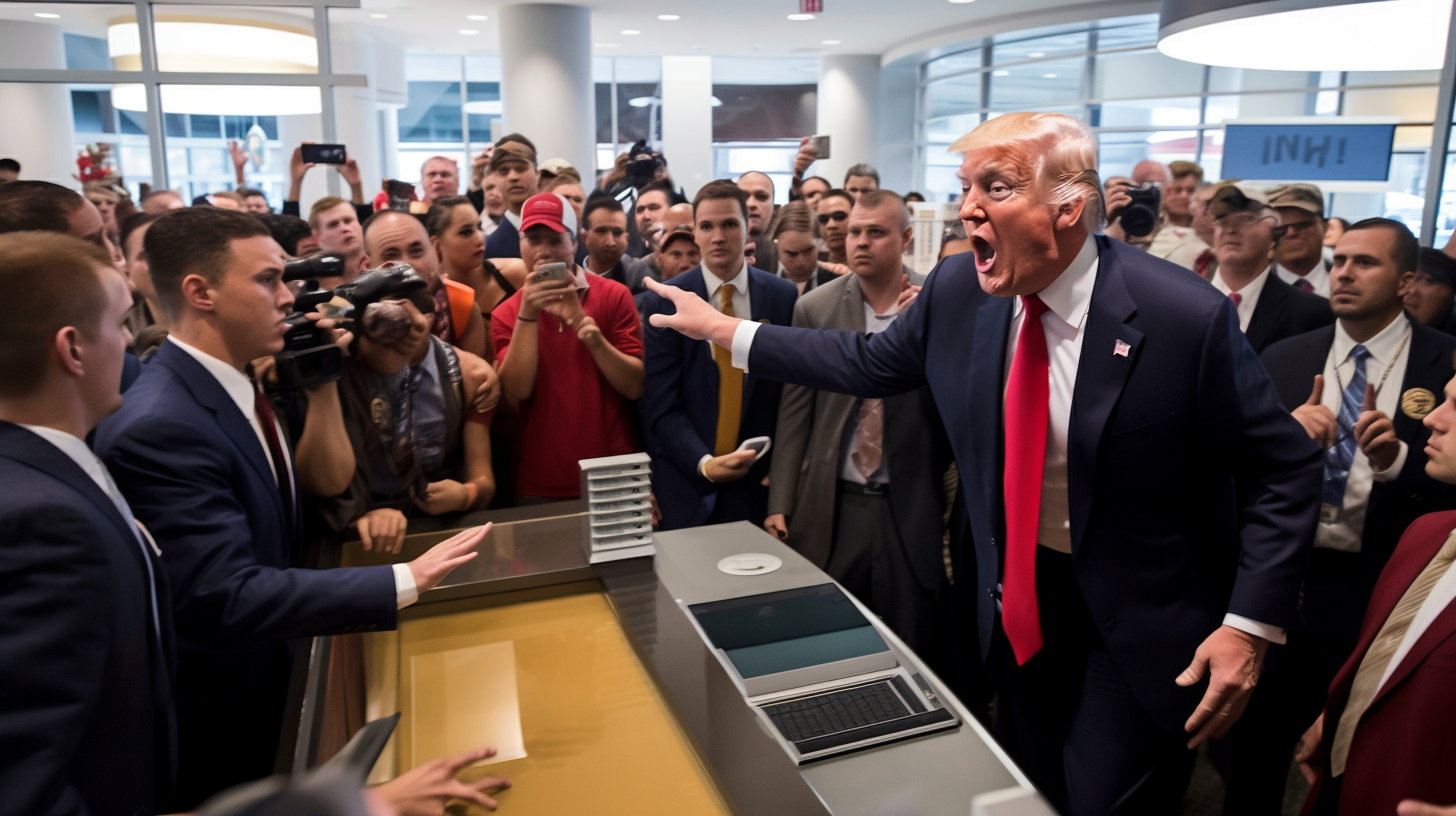 Trump leading an angry crowd to #bankrun at First Midjourney Bank, Manhattan branch. Inspired by @AaronRDay