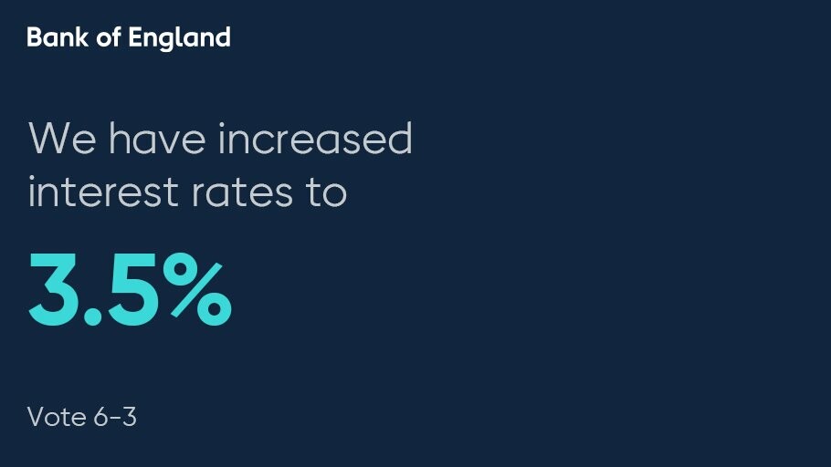 The Monetary Policy Committee voted by a majority of 6-3 to increase #BankRate to 3.5%. https://b-o-e.uk/3W2MwED