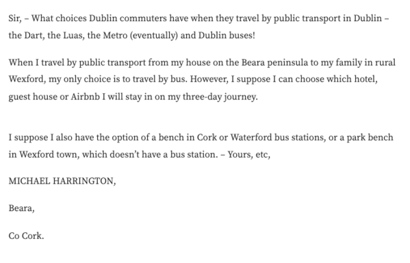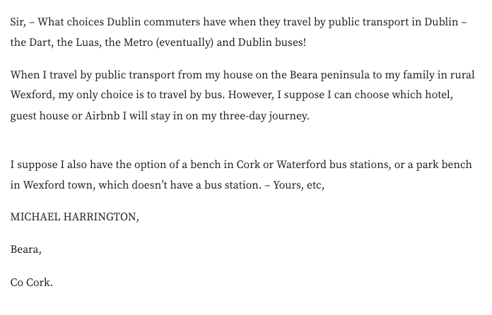 Two letters to Irish Times from people living in remote areas, complaining of the lack of public transport to bring them door to door #BearaPeninsula #Cavan https://www.irishtimes.com/opinion/letters/2023/01/12/why-politicians-dont-use-public-transport/