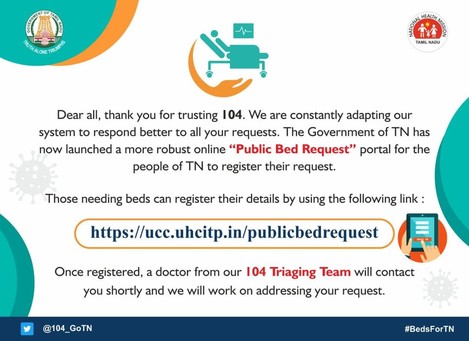Our Google Form has been replaced by a new online registration portal. Please register on https://ucc.uhcitp.in/publicbedrequest for COVID-19 bed requests. #BedsforTN #TNFightsCorona #COVID19 @NHM_TN @MoHFW_INDIA @pibchennai @RAKRI1 @deepakj2012 @albyjohnV @karthi_kp @chennaicorp