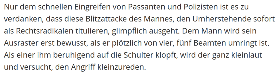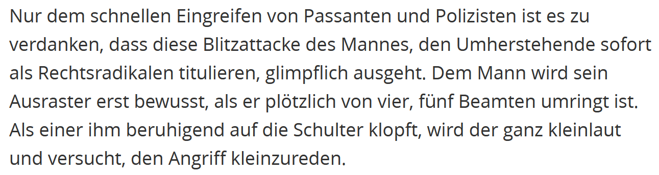 Während die #LetzteGeneration schon mal »unvorstellbare Schmerzen« angekündigt bekommt und mit #Schmerzgriffen von der Straße befördert wird, klopft die #Polizei Rechtsextremen, die Demonstrant*innen zusammenschlagen wollen, »beruhigend auf die Schulter«.