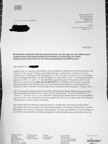 Aufgrund des Fehlens einer Mund-Nasen-Bedeckung am 12.12.2020 im Bahnhof Dresden darf ich nun 6 Monate lang in Deutschland keinen Zug mehr benutzen.