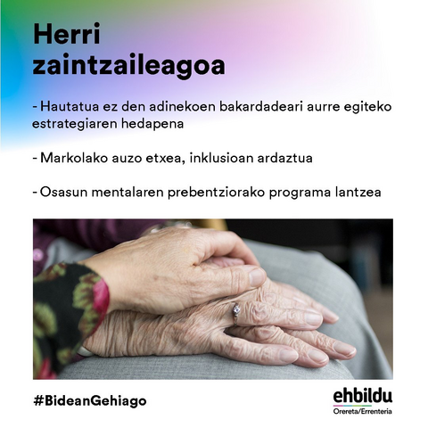 Elkar zaintzen duen herria izateko proiektu ezberdinak garatuko ditugu datozen lau urteetan. Osasun mentalari, desiratu gabeko adinekoen bakardadeari eta inklusioaren arloari erantzunez besteak beste.