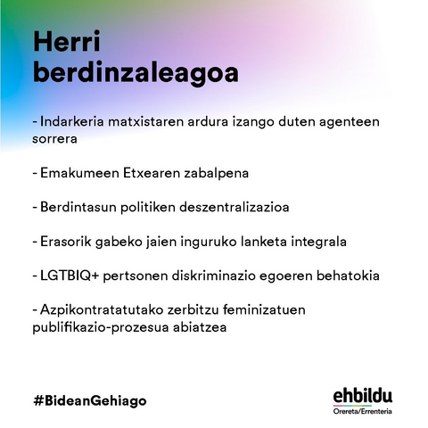 Politika feminista gehiago garatuko ditugu datozen lau urteetan. Herri berdinzaleago baten bidean pausoak emateak herri duinagoa egiten gaituelako.