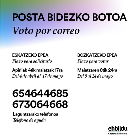 Gaurtik aurrera martxan dago posta bidezko botoa eskatzeko aukera. Maiatzaren 28an Euskal Herritik kanpo bazaude edo bozkatzera bertaratu ezin baduzu, egizu posta bidez. Edozein zalantza izatekotan jarri gurekin harremanetan WhatsApp bidez edo deituz.