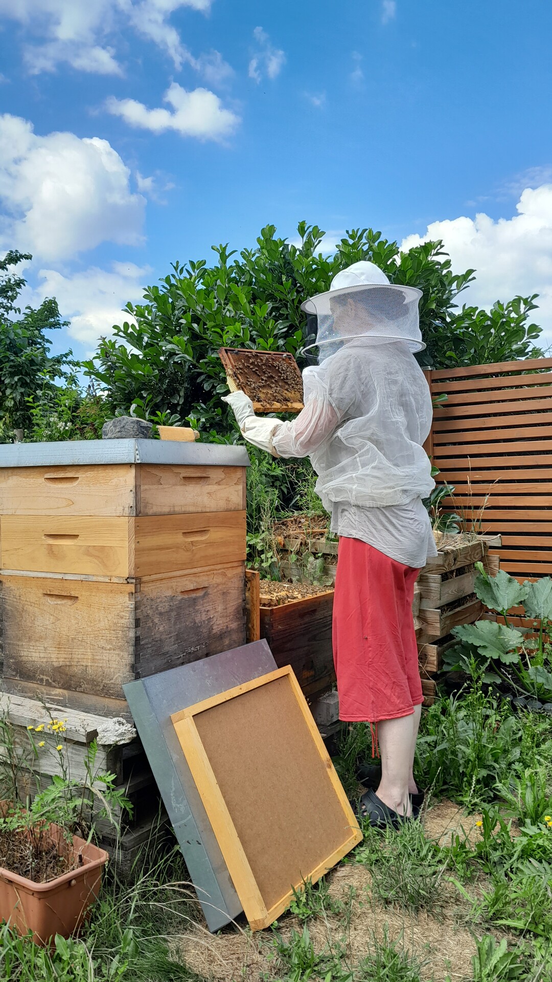 Die Zarge mit dem Wabenhonig muss warten, die ist noch nicht bienenfrei