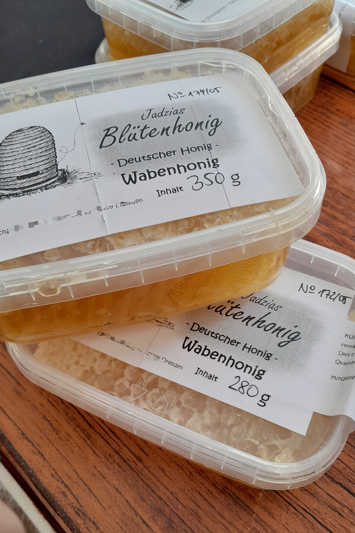 Also was wir alle kennen, ist der normale flüssige Honig in Glas. Der ist geschleudert, also aus der Wabe geholt. Später kristallisiert er, je nachdem was es für Honig ist. Raps kristallisiert schnell, Rhobinie bleibt lange flüssig.