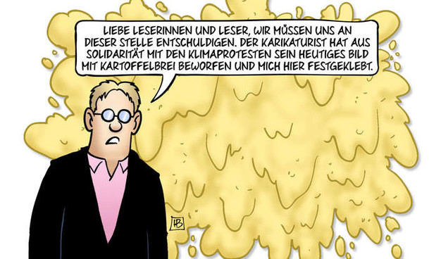 "We deeply regret. Our cartoonist covered today's comic with mashed potatoes. In solidarity with the climate protests."