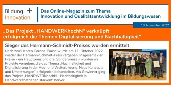 #BildungplusInnovation stellt die Preisträger des am 11. Oktober verliehenen Hermann Schmidt-Preis vor. Das Thema 2022 war "Nachhaltigkeit und #Digitalisierung in der Aus- & Weiterbildung: Neue Konzepte und Umsetzungen“ https://www.bildungsserver.de/innovationsportal/bildungplusartikel.html?artid=1286