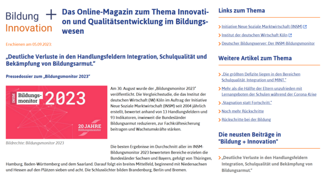 Am 30. August wurde der „Bildungsmonitor 2023“ veröffentlicht. Die Vergleichsstudie, die das @iw_koeln im Auftrag der @INSM seit 2004 jährlich erstellt, bewertet anhand von 13 Handlungsfeldern und 93 Indikatoren, inwieweit die Bundesländer #Bildungsarmut reduzieren, zur #Fachkräftesicherung beitragen und Wachstumskräfte stärken.