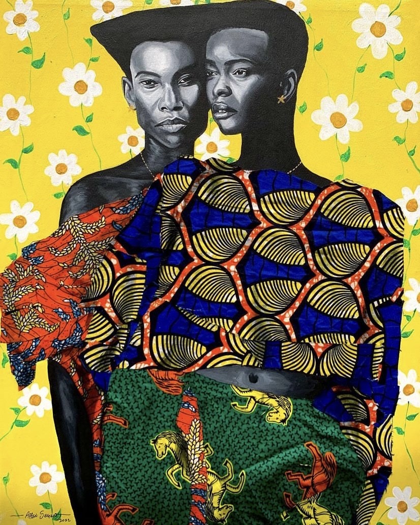 Art piece by Affen Segun Ojo titled #SoulSistersII acrylic, Ankara fabric on canvas 24 x 33 inch