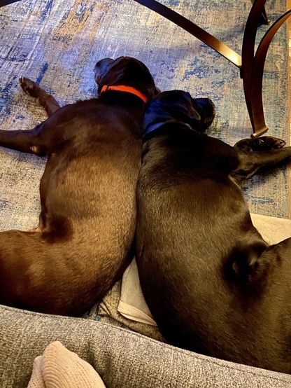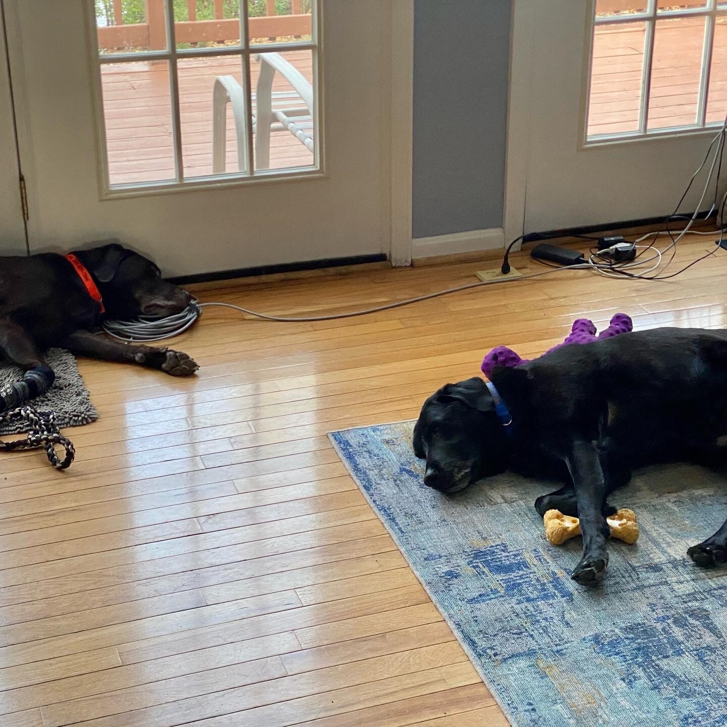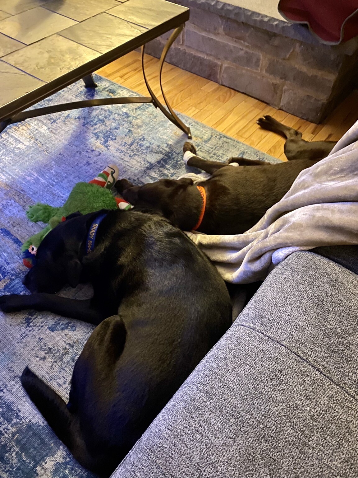 Tired boys. Also I thought I ordered the wireless Chocolate? #ChalupaBatman #ChocolateLab #Shady #BlackLab