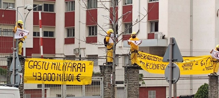 ⬛️🟨⬛️ 4 activistas, en representación de 20 colectivos, han realizado una #AcciónDirecta #Noviolenta para presentar la campaña de #ObjeciónFiscal que denuncia los 💶43.000 millones de € destinado a financiar la guerra. #BotaKuartela