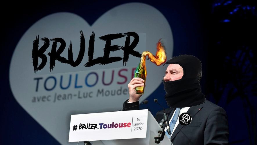 Un qu'on avait pas dans la collection, après Braquer Toulouse, Squatter Toulouse, Zbeuler Toulouse, Gilet Jauner Toulouse, LBD Toulouse et Dépaver Toulouse, tout ça avec JL MOUDENC (= dehors)