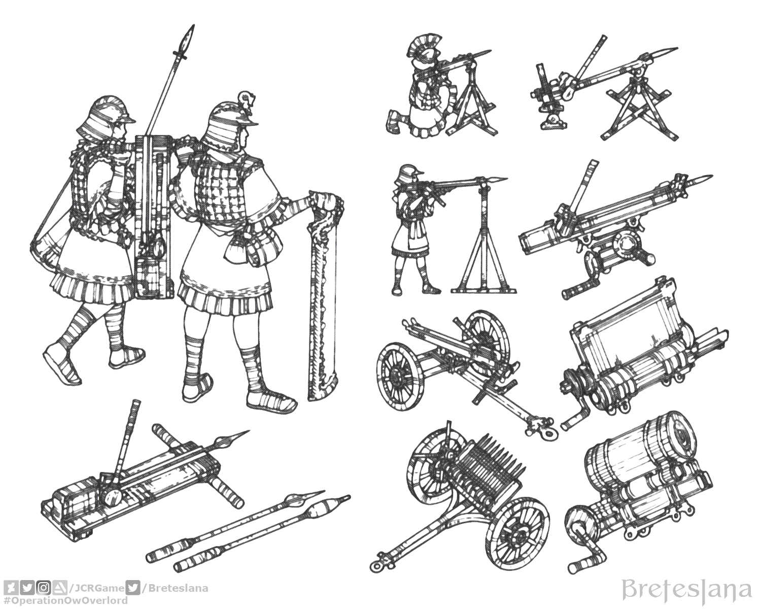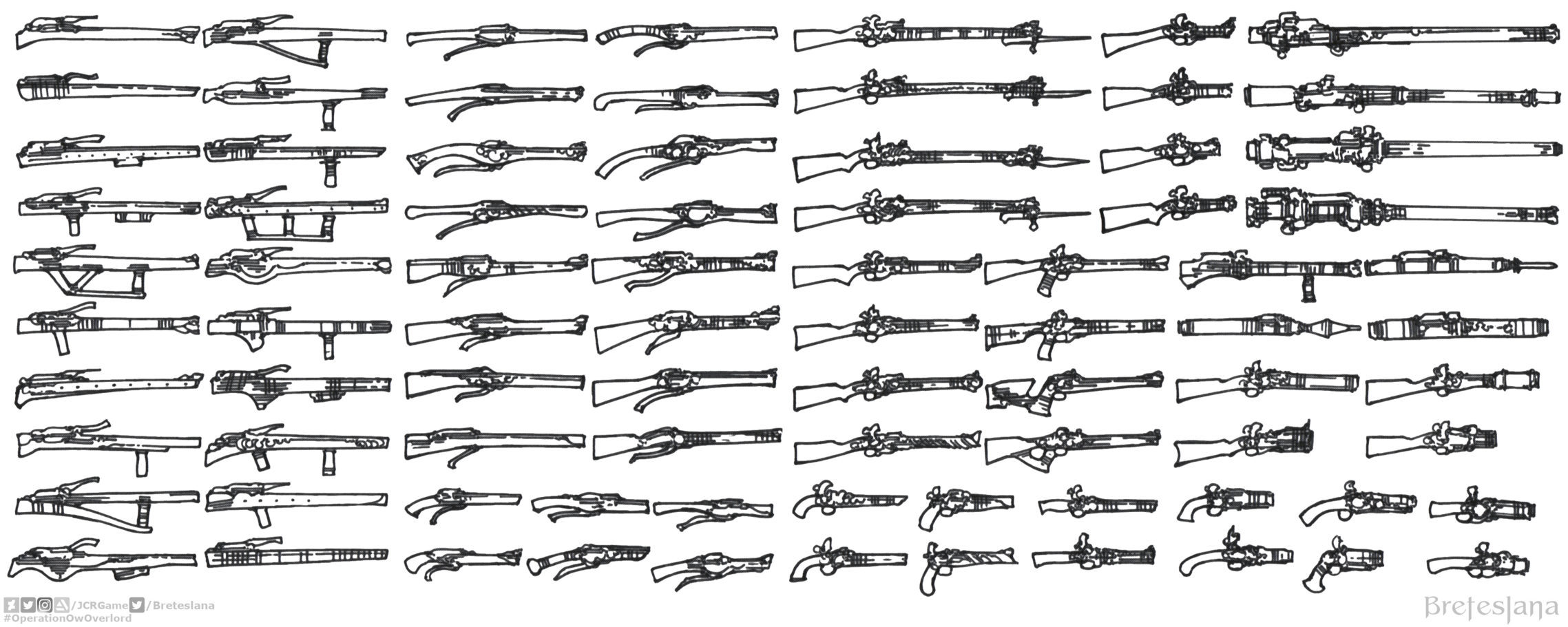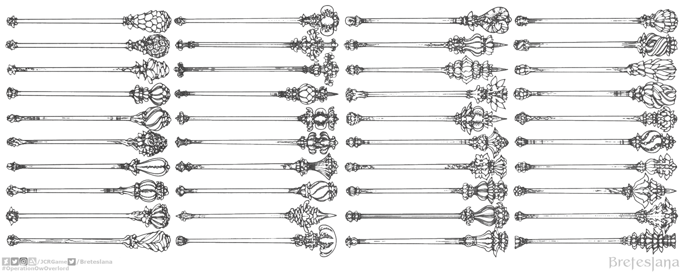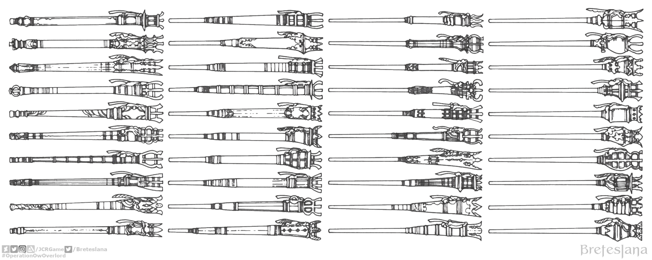 Caster-type (projectile, magic-powered) weapons from across this world's timeline. They will replace bows, and change the nature of warfare, before the beginning of the feudal period. #Breteslana #OperationOwOverlord #fantasy #drawing #conceptart