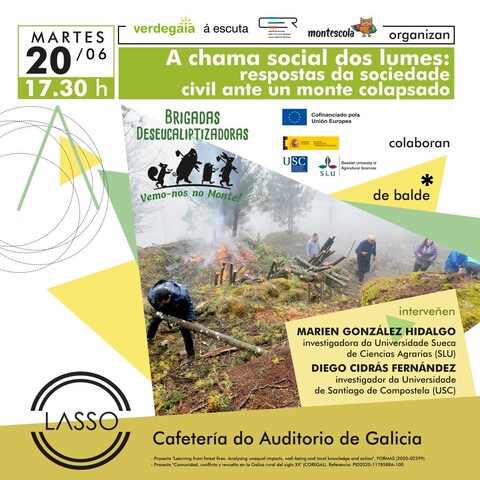 Amanhã, terça 20 de junho, às 17.30h. no restaurante Lasso (Auditório da Galiza) em Compostela: A chama social dos lumes, resposta da sociedade civil ante un monte colapsado. Organizado polas #BrigadasDeseucaliptizadoras de #Verdegaia Cos investigadores Marien González e Diego Cidrás