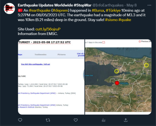 🇹🇷 An #earthquake (#deprem) happened in #Bursa, #Türkiye 10mins ago at 5:27PM on 08/05/2023 UTC. The earthquake had a magnitude of M3.3 and it was 10km (6.21 miles) deep in the ground. Stay safe! #sismo #quake