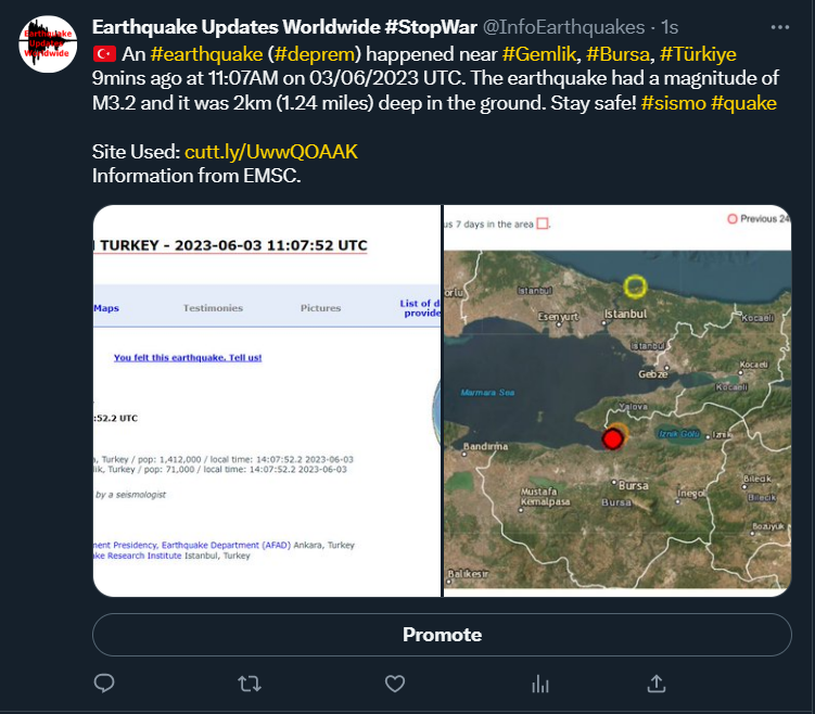 🇹🇷 An #earthquake (#deprem) happened near #Gemlik, #Bursa, #Türkiye 9mins ago at 11:07AM on 03/06/2023 UTC. The earthquake had a magnitude of M3.2 and it was 2km (1.24 miles) deep in the ground. Stay safe! #sismo #quake